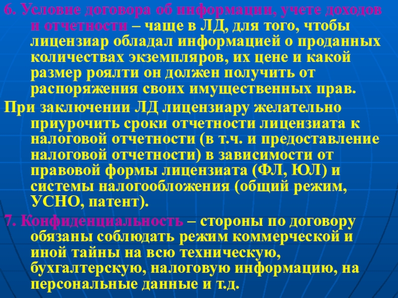 При заключении ЛД лицензиару желательно приурочить сроки отчетности лицензиата к налоговой отчетности (в т.ч. и предоставление налоговой отчетности) в зависимости от правовой формы лицензиата (ФЛ, ЮЛ) и системы налогообложения (общий режим, УСНО, патент).