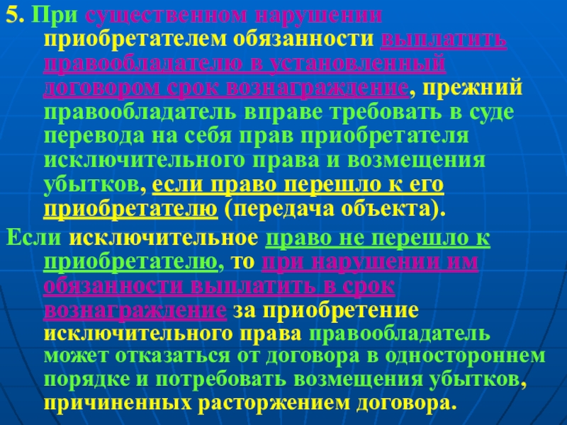 Слайд 275. При существенном нарушении приобретателем обязанности выплатить правообладателю в установленный