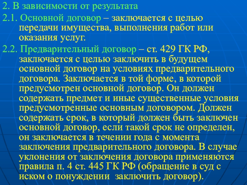 – ст. 429 ГК РФ, заключается с целью заключить в будущем основной договор на условиях предварительного договора. Заключается в той форме, в которой предусмотрен основной договор. Он должен содержать предмет и иные существенные условия предусмотренные основным договором. Должен содержать срок, в который должен быть заключен основной договор, если такой срок не определен, он заключается в течении года с момента заключения предварительного договора. В случае уклонения от заключения договора применяются правила п. 4 ст. 445 ГК РФ (обращение в суд с иском о понуждении заключить договор).