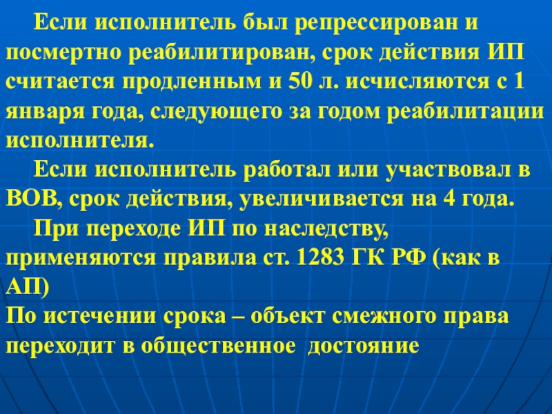Если исполнитель был репрессирован и посмертно реабилитирован, срок действия