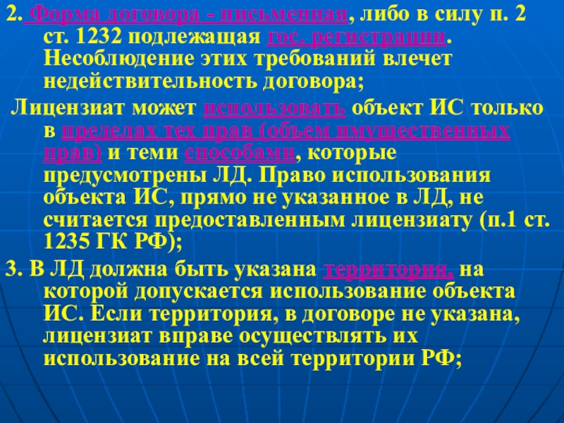 3. В ЛД должна быть указана территория, на которой допускается использование объекта ИС. Если территория, в договоре не указана, лицензиат вправе осуществлять их использование на всей территории РФ;