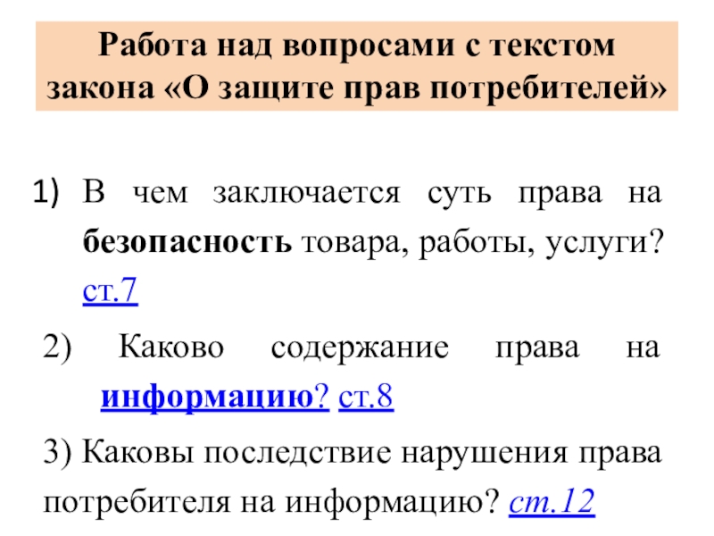 Слайд 8 Работа над вопросами с текстом закона «О защите прав потребителей»