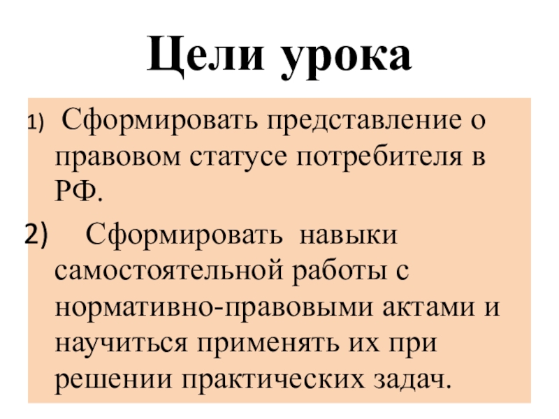 Цели урока	Сформировать представление о правовом статусе потребителя в РФ.   Сформировать навыки самостоятельной работы с нормативно-правовыми