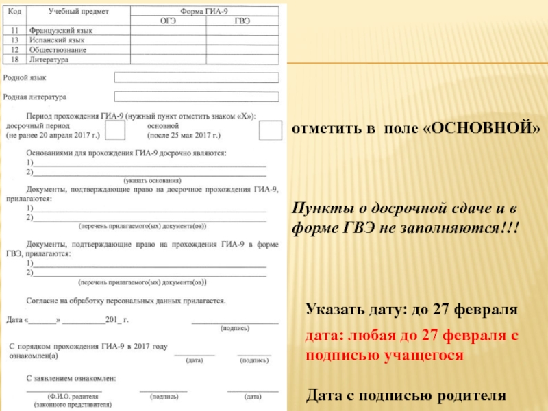 Пункты о досрочной сдаче и в форме ГВЭ не заполняются!!!