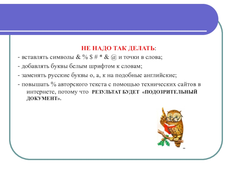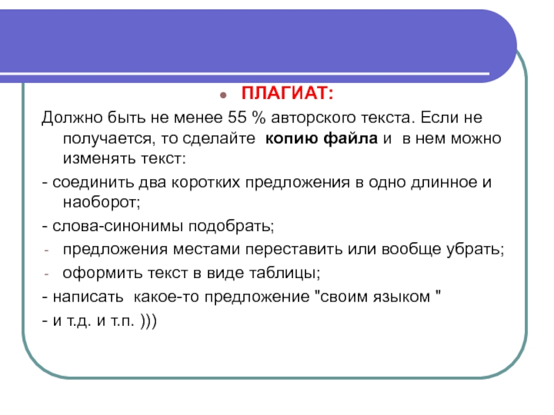 - повышать % авторского текста с помощью технических сайтов в интернете, потому что РЕЗУЛЬТАТ БУДЕТ «ПОДОЗРИТЕЛЬНЫЙ ДОКУМЕНТ».