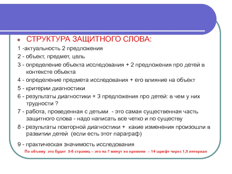По объему это будет 5-6 страниц – это на 7 минут по времени – 14 шрифт через 1,5 интервал