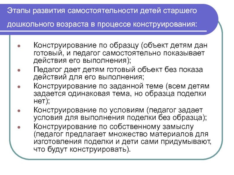 Слайд 29Этапы развития самостоятельности детей старшего дошкольного возраста в процессе конструирования:
