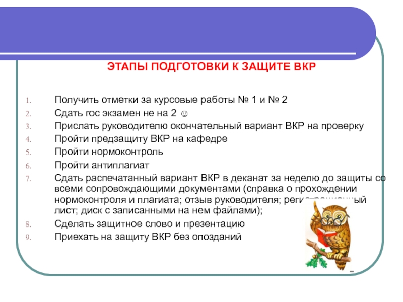 Сдать распечатанный вариант ВКР в деканат за неделю до защиты со всеми сопровождающими документами (справка о прохождении нормоконтроля и плагиата; отзыв руководителя; регистрационный лист; диск с записанными на нем файлами);