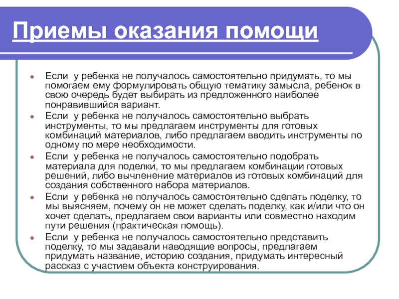 Если у ребенка не получалось самостоятельно сделать поделку, то мы выясняем, почему он не может сделать поделку, как и/или что он хочет сделать, предлагаем свои варианты или совместно находим пути решения (практическая помощь).