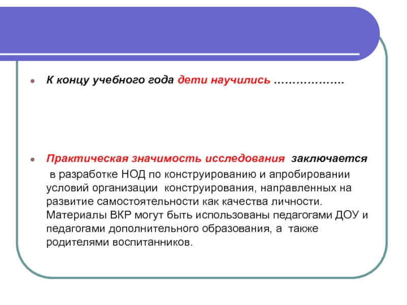 условий организации конструирования, направленных на развитие самостоятельности как качества личности. Материалы ВКР могут быть использованы педагогами ДОУ и педагогами дополнительного образования, а также родителями воспитанников.