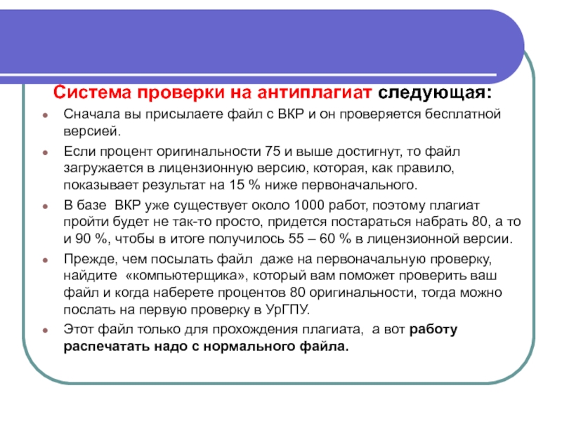 Прежде, чем посылать файл даже на первоначальную проверку, найдите «компьютерщика», который вам поможет проверить ваш файл и когда наберете процентов 80 оригинальности, тогда можно послать на первую проверку в УрГПУ.