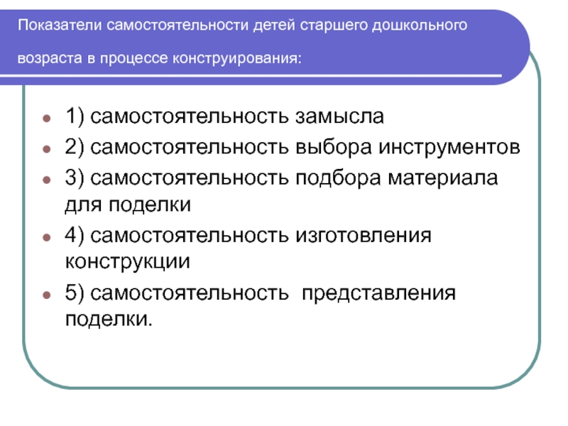Слайд 21Показатели самостоятельности детей старшего дошкольного возраста в процессе конструирования: