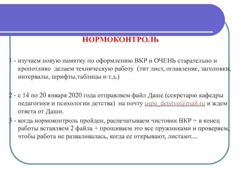2 - с 14 по 20 января 2020 года отправляем файл Даше (секретарю кафедры педагогики и психологии детства) на почту uspu_detstvo@mail.ru и ждем ответа от Даши.