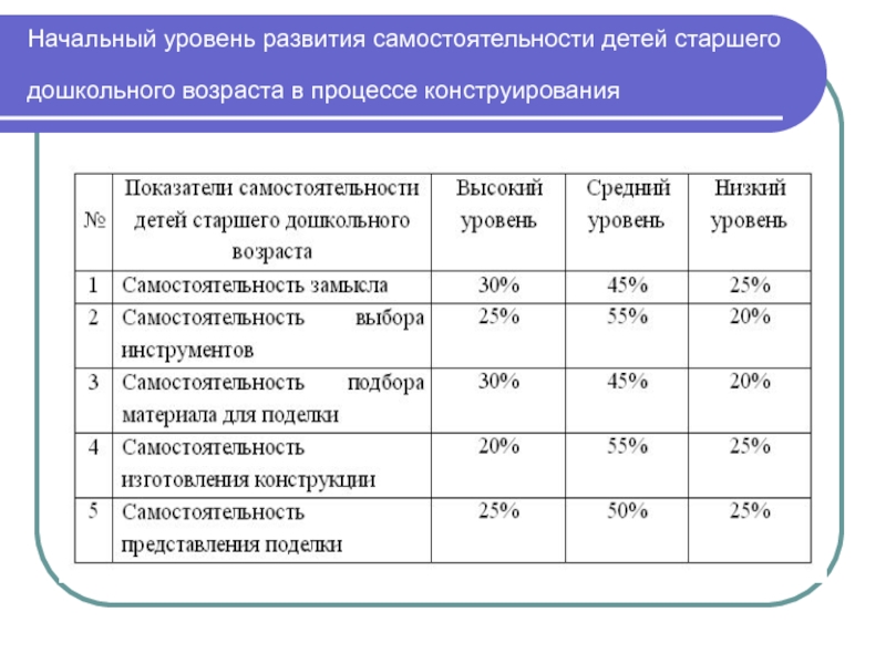 Слайд 26Начальный уровень развития самостоятельности детей старшего дошкольного возраста в процессе