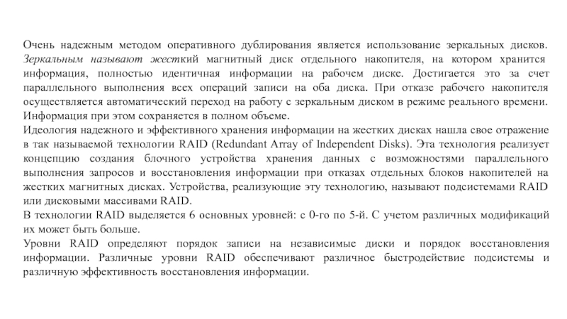 Слайд 8Очень надежным методом оперативного дублирования является использование зеркальных дисков. Зеркальным