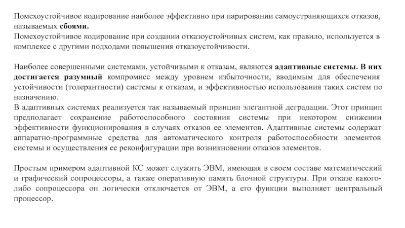 Слайд 13Помехоустойчивое кодирование наиболее эффективно при парировании самоустраняющихся отказов, называемых сбоями.
