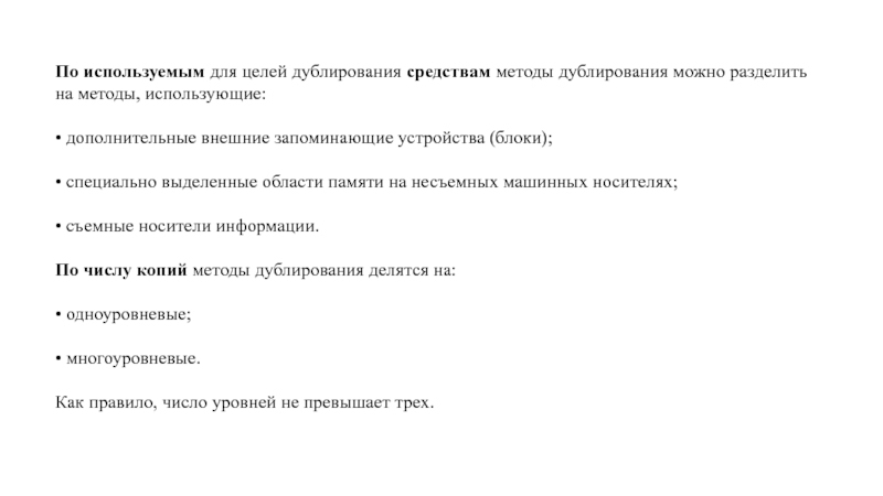 Слайд 4По используемым для целей дублирования средствам методы дублирования можно разделить