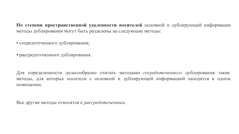 Для определенности целесообразно считать методами сосредоточенного дублирования такие методы, для которых носители с основной и дублирующей информацией находятся в одном помещении.
