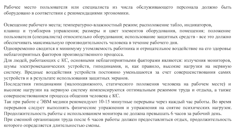 Слайд 16Рабочее место пользователя или специалиста из числа обслуживающего персонала должно
