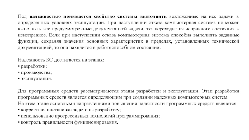 Для программных средств рассматриваются этапы разработки и эксплуатации. Этап разработки программных средств является определяющим при создании надежных компьютерных систем.