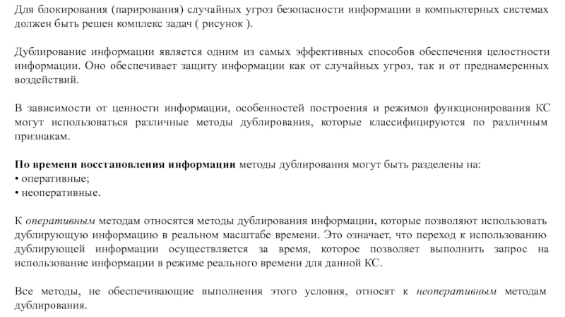 Для блокирования (парирования) случайных угроз безопасности информации в компьютерных системах должен быть решен комплекс задач ( рисунок ).Дублирование информации является одним из самых эффективных способов обеспечения целостности информации. Оно обеспечивает защиту