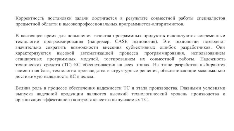 продуктов используются современные технологии программирования (например, CASE технология). Эти технологии позволяют значительно сократить возможности внесения субъективных ошибок разработчиков. Они характеризуются высокой автоматизацией процесса программирования, использованием стандартных программных модулей, тестированием их совместной работы. Надежность технических средств (ТС) КС обеспечивается на всех этапах. На этапе разработки выбираются элементная база, технология производства и структурные решения, обеспечивающие максимально достижимую надежность КС в целом.