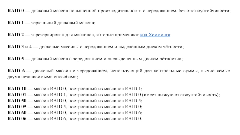 RAID 0 — дисковый массив повышенной производительности с чередованием, без отказоустойчивости;RAID 1 — зеркальный дисковый массив;RAID 2 — зарезервирован для