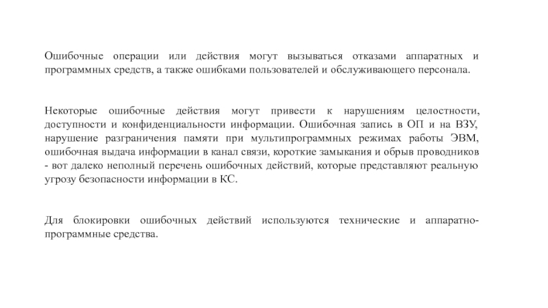 Слайд 14Ошибочные операции или действия могут вызываться отказами аппаратных и программных