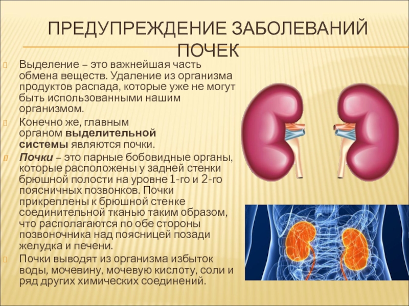 Почки выводят из организма избыток воды, мочевину, мочевую кислоту, соли и ряд других химических соединений.