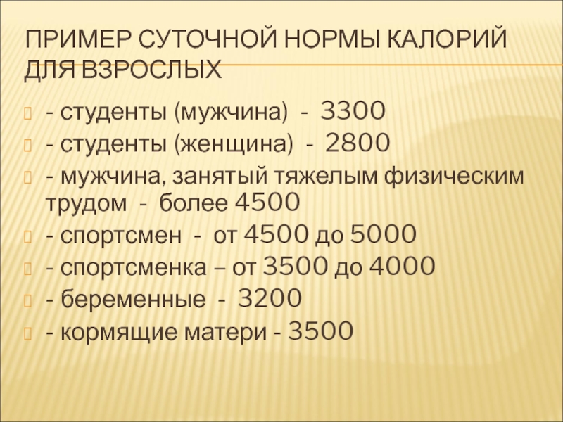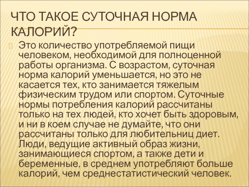 но это не касается тех, кто занимается тяжелым физическим трудом или спортом. Суточные нормы потребления калорий рассчитаны только на тех людей, кто хочет быть здоровым, и ни в коем случае не думайте, что они рассчитаны только для любительниц диет. Люди, ведущие активный образ жизни, занимающиеся спортом, а также дети и беременные, в среднем употребляют больше калорий, чем среднестатистический человек.