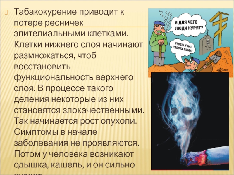 Слайд 74Табакокурение приводит к потере ресничек эпителиальными клетками. Клетки нижнего слоя