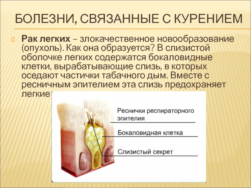 в которых оседают частички табачного дым. Вместе с ресничным эпителием эта слизь предохраняет легкие от сильного загрязнения.
