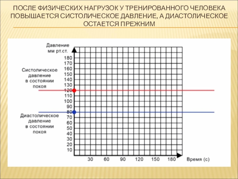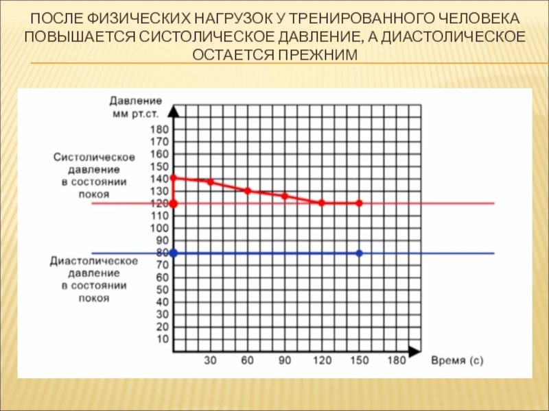 Слайд 61После физических нагрузок у тренированного человека повышается систолическое давление, а