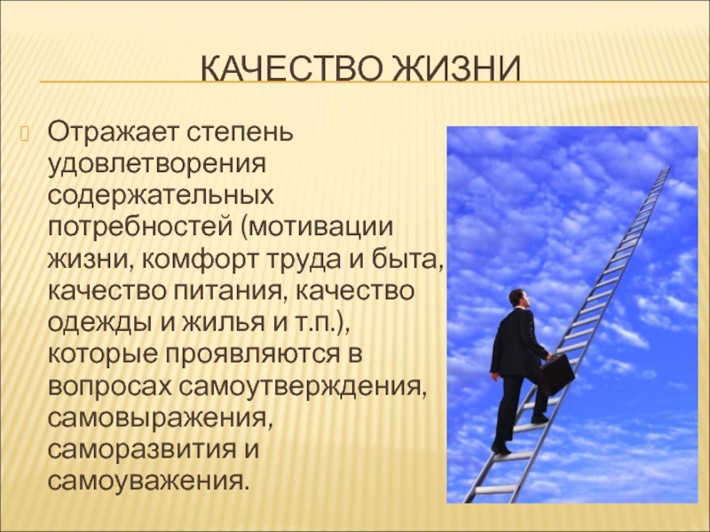 Отражает степень удовлетворения содержательных потребностей (мотивации жизни, комфорт труда