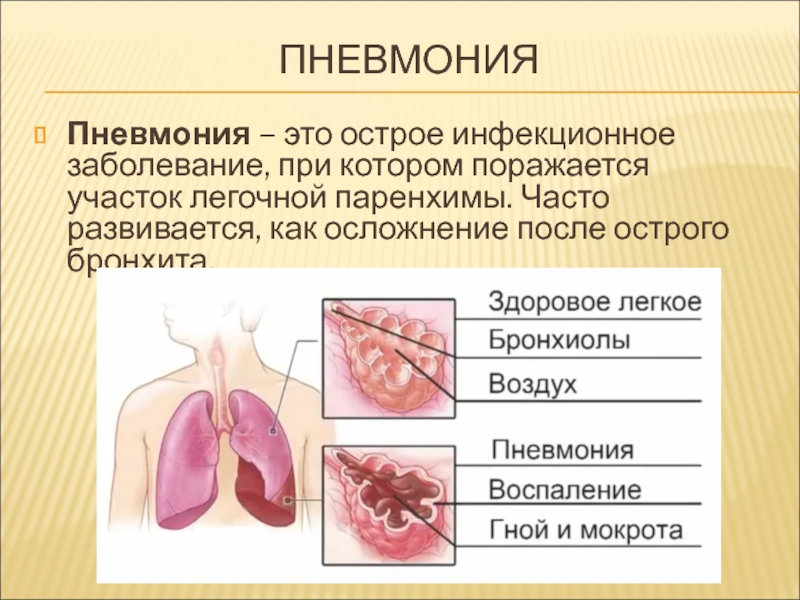 Пневмония – это острое инфекционное заболевание, при котором поражается участок легочной