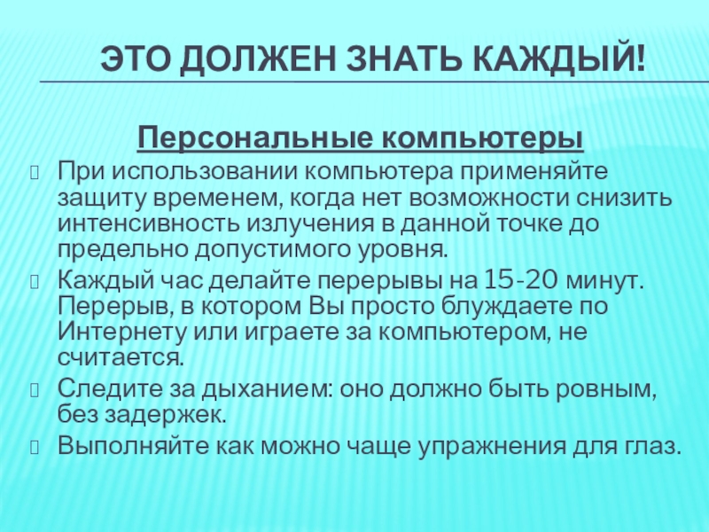 Каждый час делайте перерывы на 15-20 минут. Перерыв, в котором Вы просто блуждаете по Интернету или играете за компьютером, не считается.