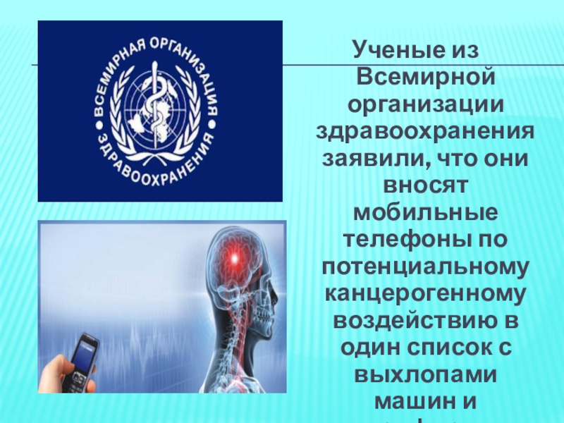 Слайд 19Ученые из Всемирной организации здравоохранения заявили, что они вносят мобильные