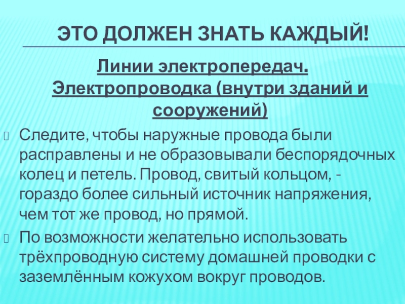 чтобы наружные провода были расправлены и не образовывали беспорядочных колец и петель. Провод, свитый кольцом, - гораздо более сильный источник напряжения, чем тот же провод, но прямой.