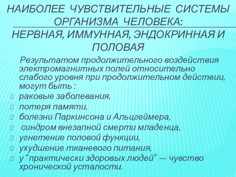 Результатом продолжительного воздействия электромагнитных полей относительно слабого уровня при продолжительном действии, могут быть :