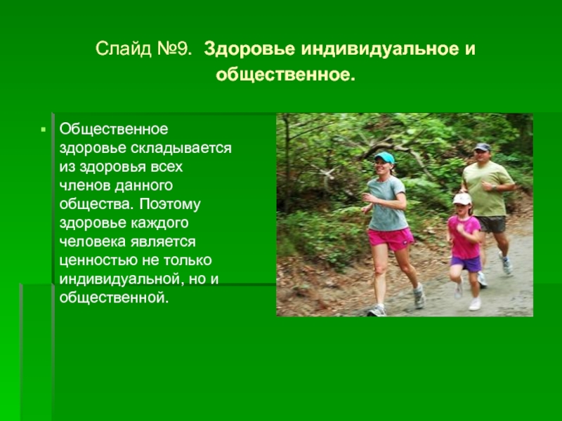 Слайд 9Слайд №9. Здоровье индивидуальное и общественное.