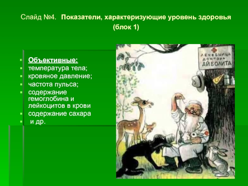 Слайд №4. Показатели, характеризующие уровень здоровья (блок 1)Объективные:температура тела;кровяное давление;частота пульса;содержание гемоглобина и лейкоцитов в кровисодержание сахара