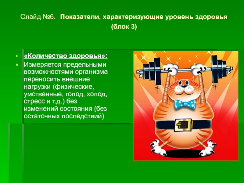 Слайд №6. Показатели, характеризующие уровень здоровья (блок 3)«Количество здоровья»:Измеряется предельными возможностями организма переносить внешние нагрузки (физические, умственные,
