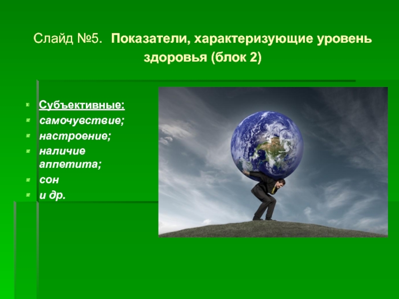 Слайд №5. Показатели, характеризующие уровень здоровья (блок 2)Субъективные:самочувствие;настроение;наличие аппетита;сони др.