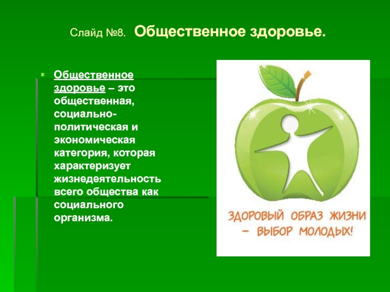 Слайд №8. Общественное здоровье.Общественное здоровье – это общественная, социально-политическая и экономическая категория, которая характеризует жизнедеятельность всего общества