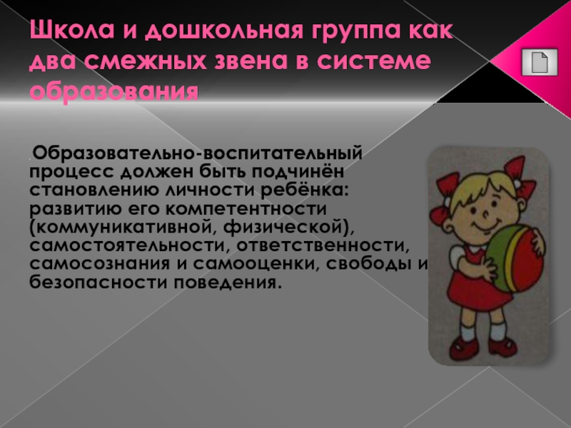 Слайд 3Школа и дошкольная группа как два смежных звена в системе