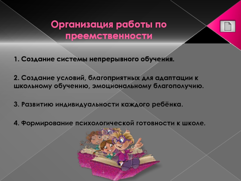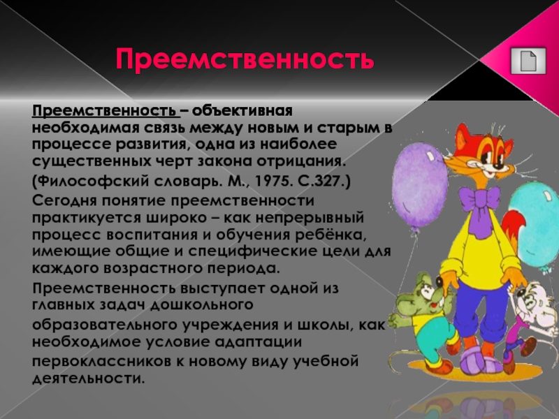 Сегодня понятие преемственности практикуется широко – как непрерывный процесс воспитания и обучения ребёнка, имеющие общие и специфические цели для каждого возрастного периода.