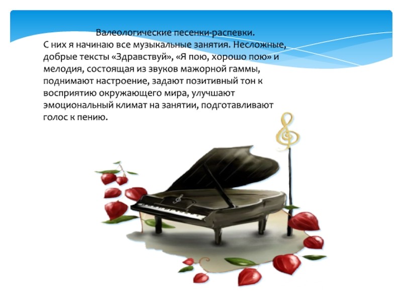 Несложные, добрые тексты «Здравствуй», «Я пою, хорошо пою» и мелодия, состоящая из звуков мажорной гаммы, поднимают настроение, задают позитивный тон к восприятию окружающего мира, улучшают эмоциональный климат на занятии, подготавливают голос к пению.