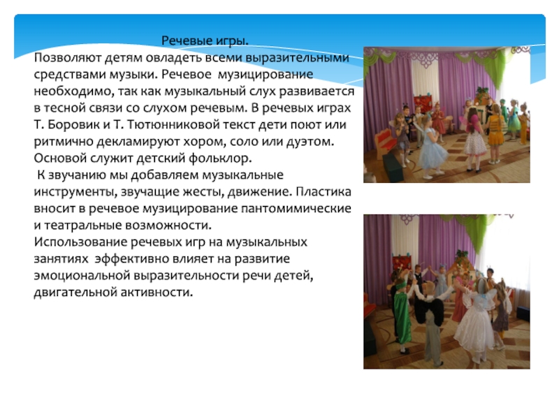 Позволяют детям овладеть всеми выразительными средствами музыки. Речевое музицирование необходимо, так как музыкальный слух развивается в тесной связи со слухом речевым. В речевых играх Т. Боровик и Т. Тютюнниковой текст дети поют или ритмично декламируют хором, соло или дуэтом. Основой служит детский фольклор.