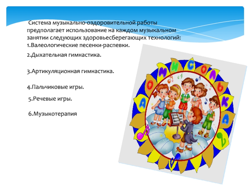 Слайд 3 Система музыкально-оздоровительной работы предполагает использование на каждом музыкальном занятии