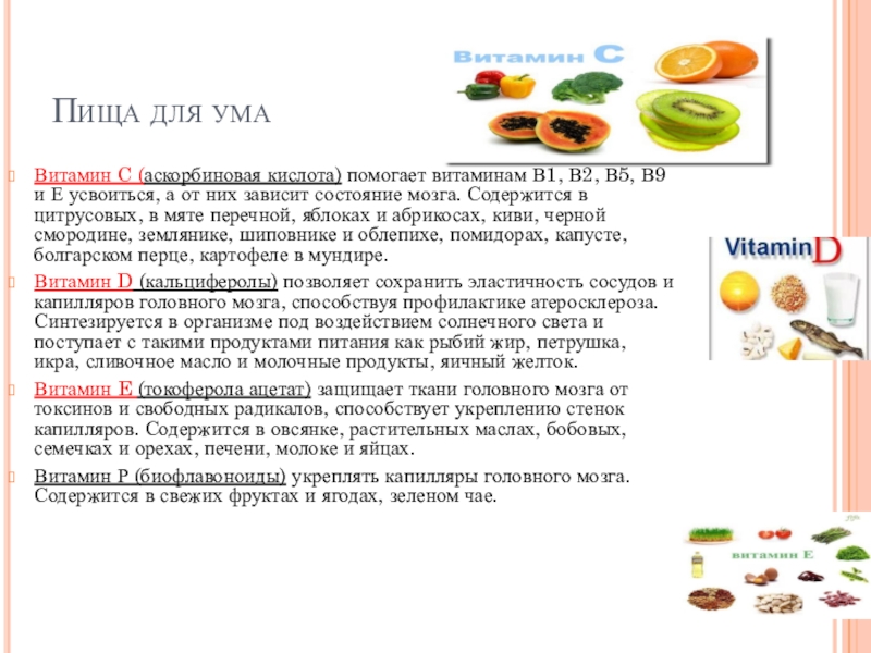 мозга. Содержится в цитрусовых, в мяте перечной, яблоках и абрикосах, киви, черной смородине, землянике, шиповнике и облепихе, помидорах, капусте, болгарском перце, картофеле в мундире.